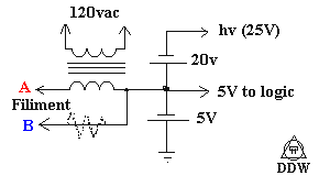 The amount of filiment voltage varies with the display kind, the one in a vcr that i reverse engineered used about 8Vp-p, a smaller display used 4Vp-p, if a transformer of the right voltage isn't on hand a resistor (dotted in) can be used.